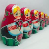 Rosyjski drewniane zagnieżdżenia Lalka z ciemnym kolorze niebieskim z białymi kwiatami. Kolekcjonerska produkt i ładny wystrój domu. Zestaw 7 sztuk, wysokość 13,5 cm.